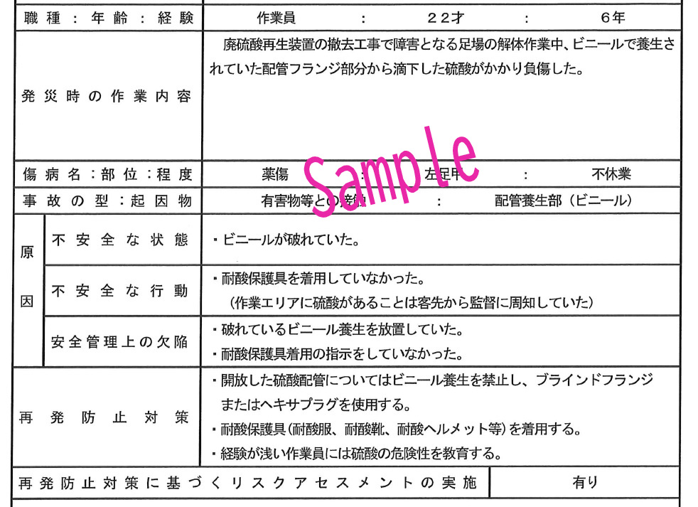 したがって純然たる事故報告書とは異なり、事故事例の検討、勉強会に有効に利用できるように工夫されています。また事故の概要説明図は、写真ではなくイラストを用いているので、危険のポイント視覚的に非常に分かりやすく描かれており、イラストだけを見れば次にどのような事象が起こったのかを容易に推測することが出来ます。
